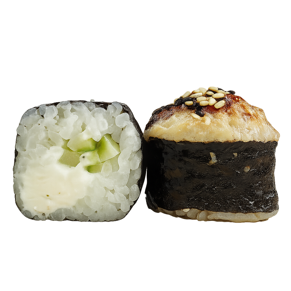 Рис, Нори, Сливочный сыр, Огурец. Шапка: моцарелла, майонез, угорь, унаги, кунжут.