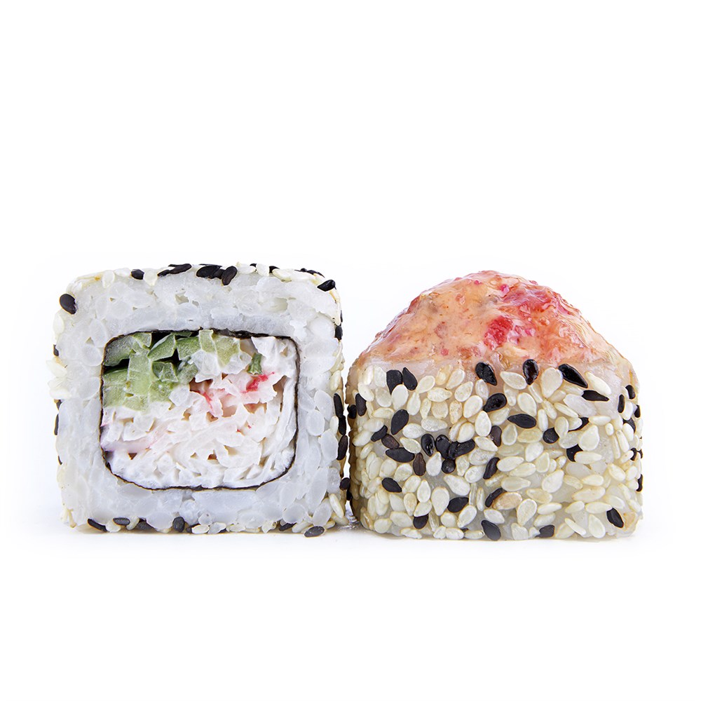 Рис, Норри, Огурец, Снежный краб, Лосось с/с, Спайси соус, Кунжут.