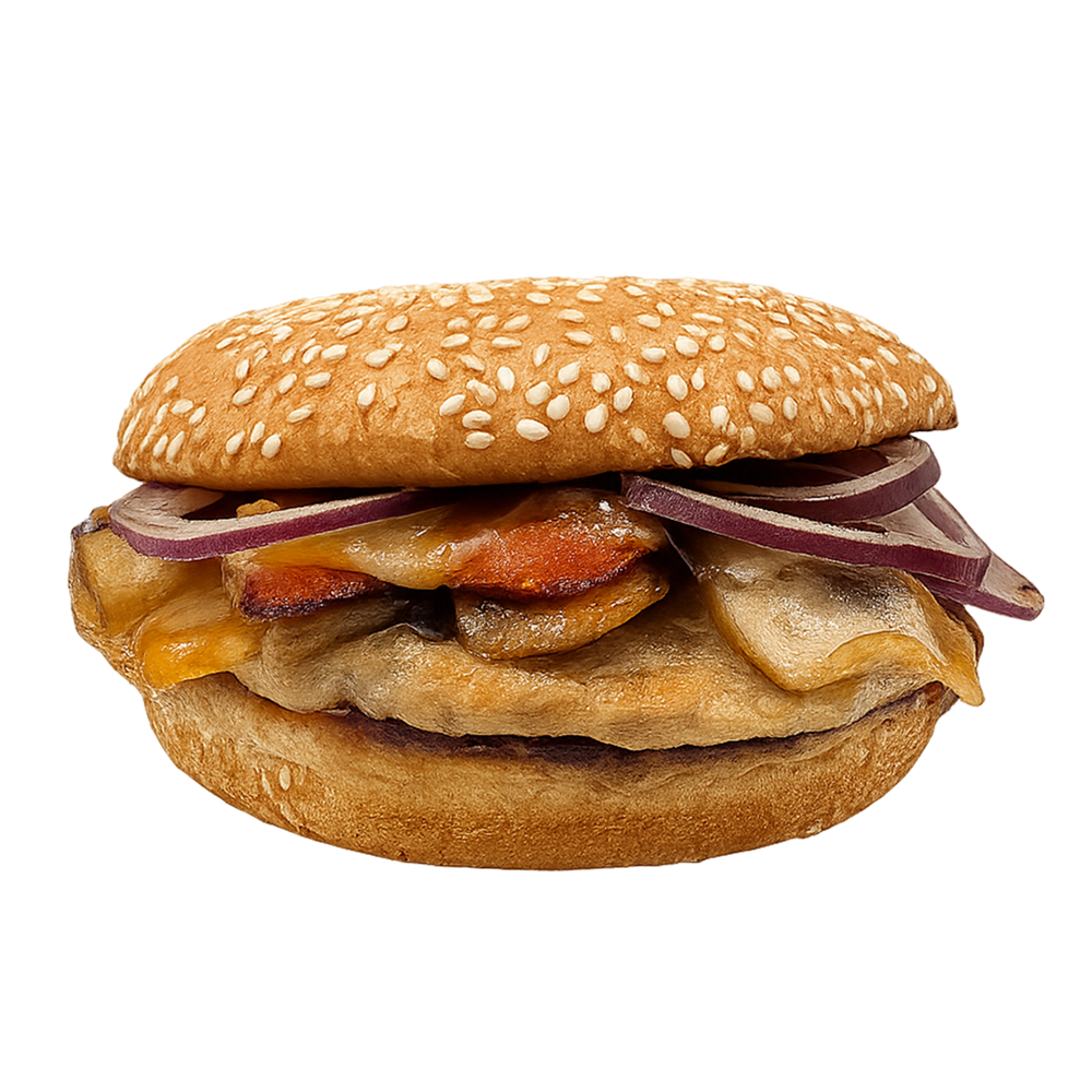 Булочка картофельная, Соус Барбекю, Котлета куриная, Жареные шампиньоны, Перец болгарский гриль, Лук красный, Сыр гауда.
