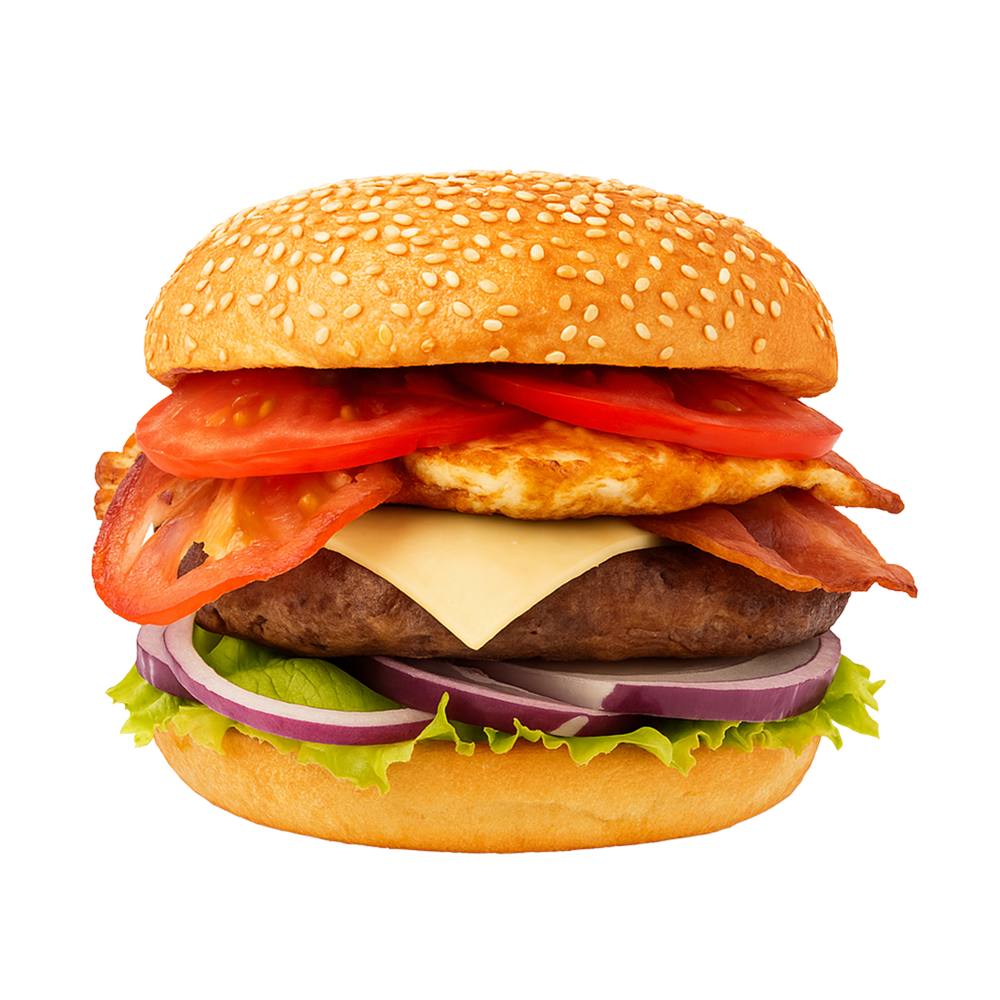 Булочка картофельная, Соус барбекю, Котлета говяжья, Бекон, Айсберг, Яйцо куриное, Лук красный, Свежие томаты, Сыр гауда.