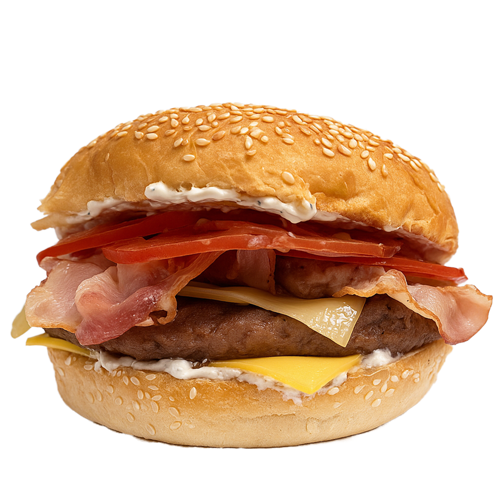 Булочка картофельная, Соус сливочно-грибной, Котлета говяжья, Бекон, Свежие томаты, Сыр гауда, Сыр чеддер.