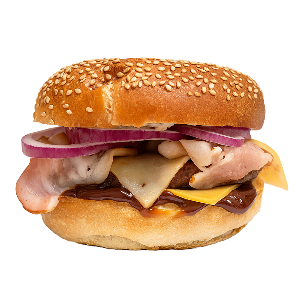 Булочка картофельная, Соус барбекю, Соус чесночный, Котлета говяжья, Бекон, Лук красный, Сыр гайда, Сыр чеддер.