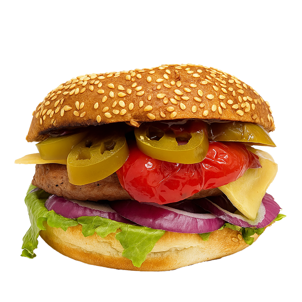 Булочка картофельная, Соус барбекю, Котлета говяжья, Айсберг, Перец болгарский гриль, Лук красный, Перец халапеньо, Сыр гауда.