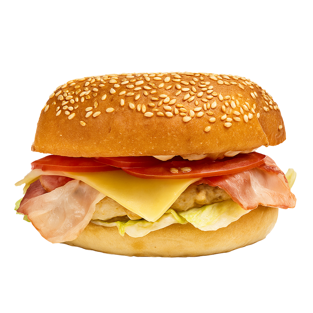 Булочка картофельная, Соус цезарь, Котлета куриная, Бекон, Айсберг, Свежие томаты, Сыр гауда.