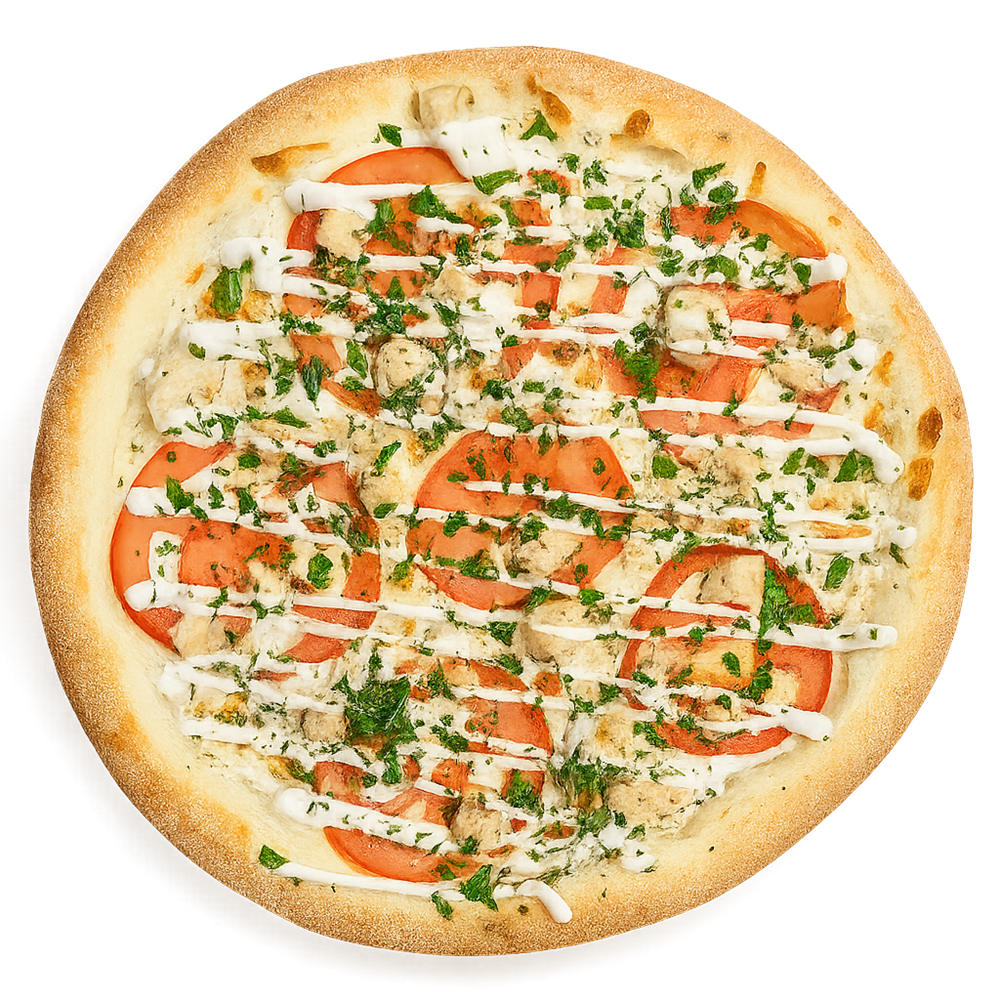 Соус белый, Сыр моцарелла, Свежие томаты, Куриное филе, Соус чесночный, Зелень.