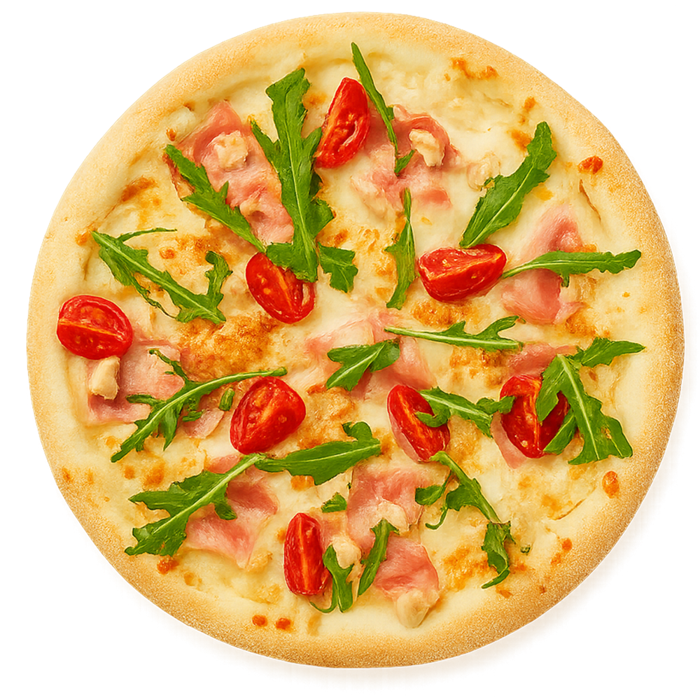 Соус белый, Сыр моцарелла, Свежие томаты, Куриное филе, Соус чесночный, Зелень.