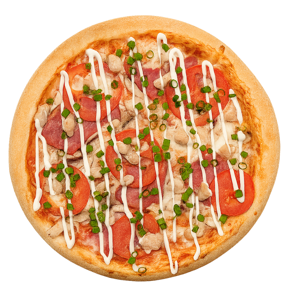 Соус красный, Сыр моцарелла, Ветчина, Шампиньоны, Свинина, Свежие томаты, Чесночный соус, Зеленый лук.