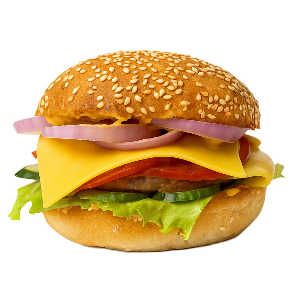 Булочка картофельная, Соус сырный, Котлета куриная, Лук красный, Свежие томаты, Огурцы свежие, Сыр гауда, Сыр чеддер.