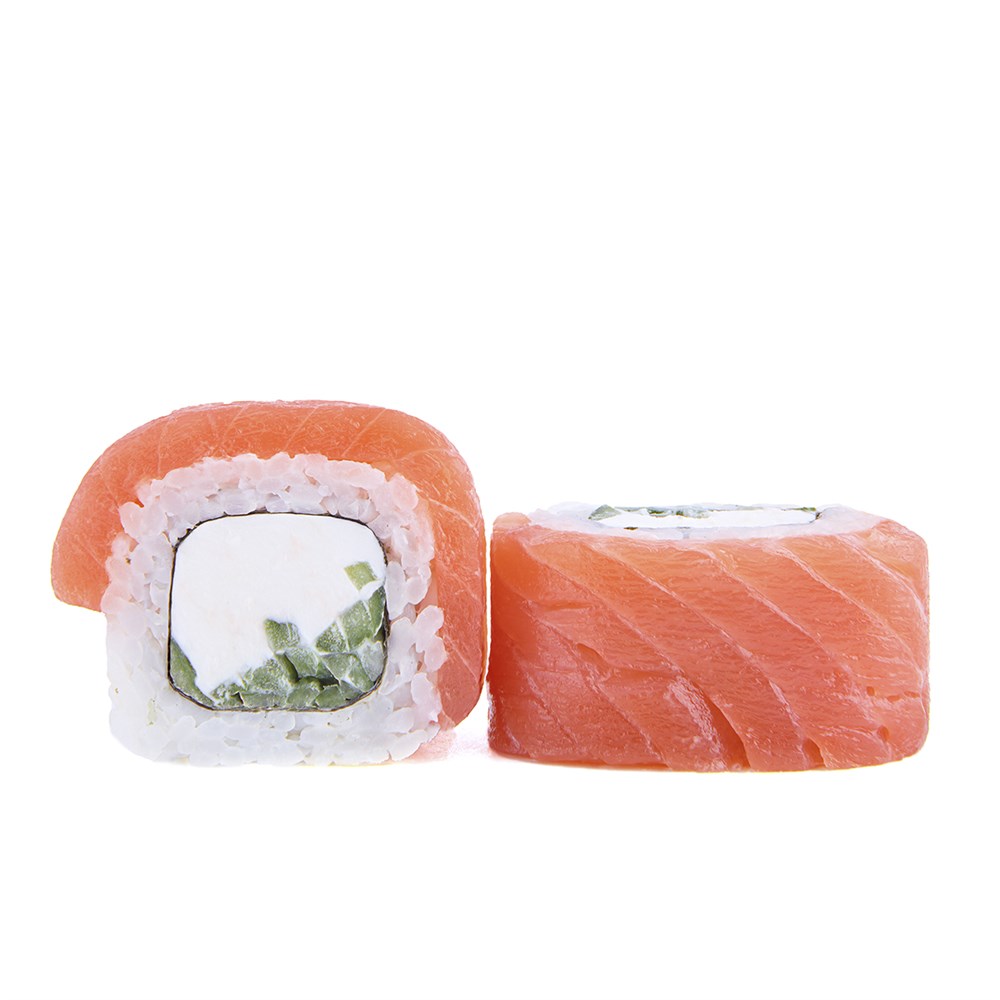 Рис, Норри, Сыр сливочный, Лосось копченый, Огурец.