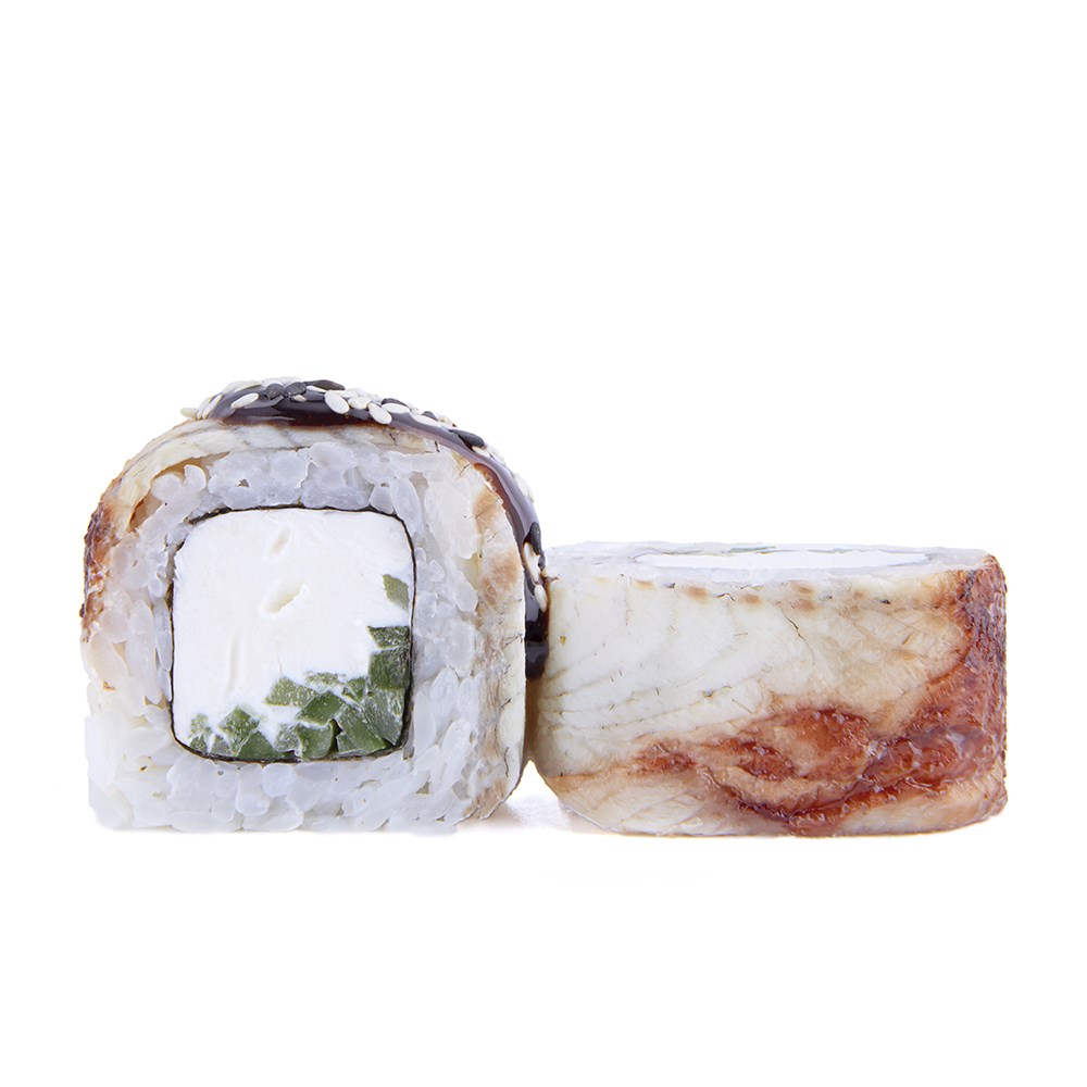 Рис, Норри, Сыр сливочный, Угорь, Огурец, Соус унаги, Кунжут.
