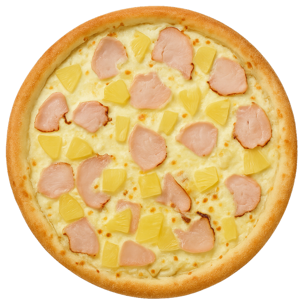 Соус белый, Сыр моцарелла, Куриное филе копченое, Ананас.