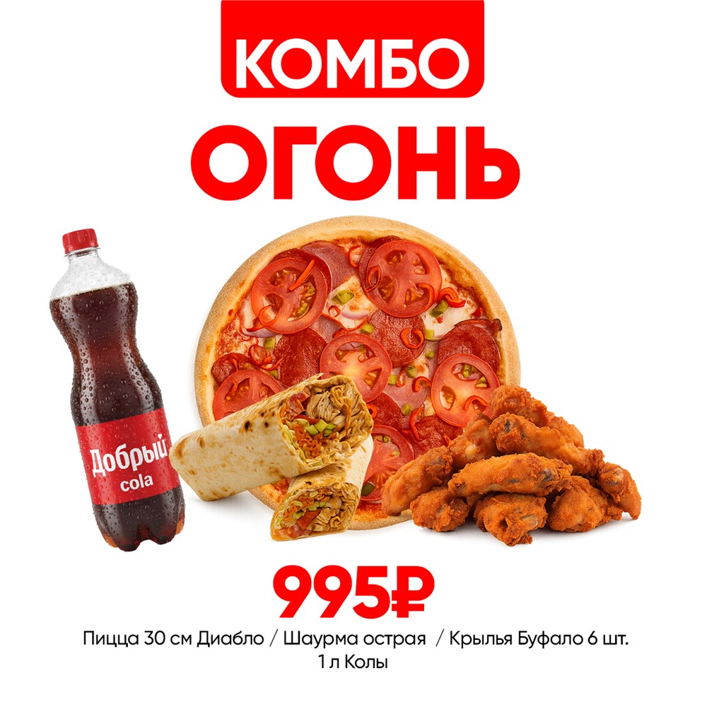 Пицца 30см. "Дьявола", Шаурма острая, Крылья буффало 6 шт., 1л. Колы.
