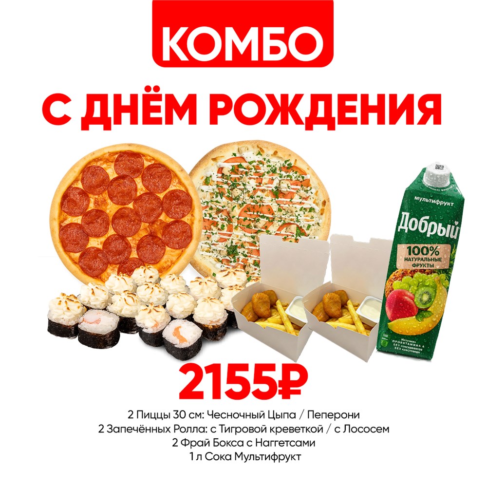 2 пиццы 30см.: "Чесночный Цыпа" и " Пеперони", 2 запеченных ролла: "С Тигровой креветкой" и "С Лососем", 2 Фрай бокса с Наггетсами, 1л. сока Мультифрукт.