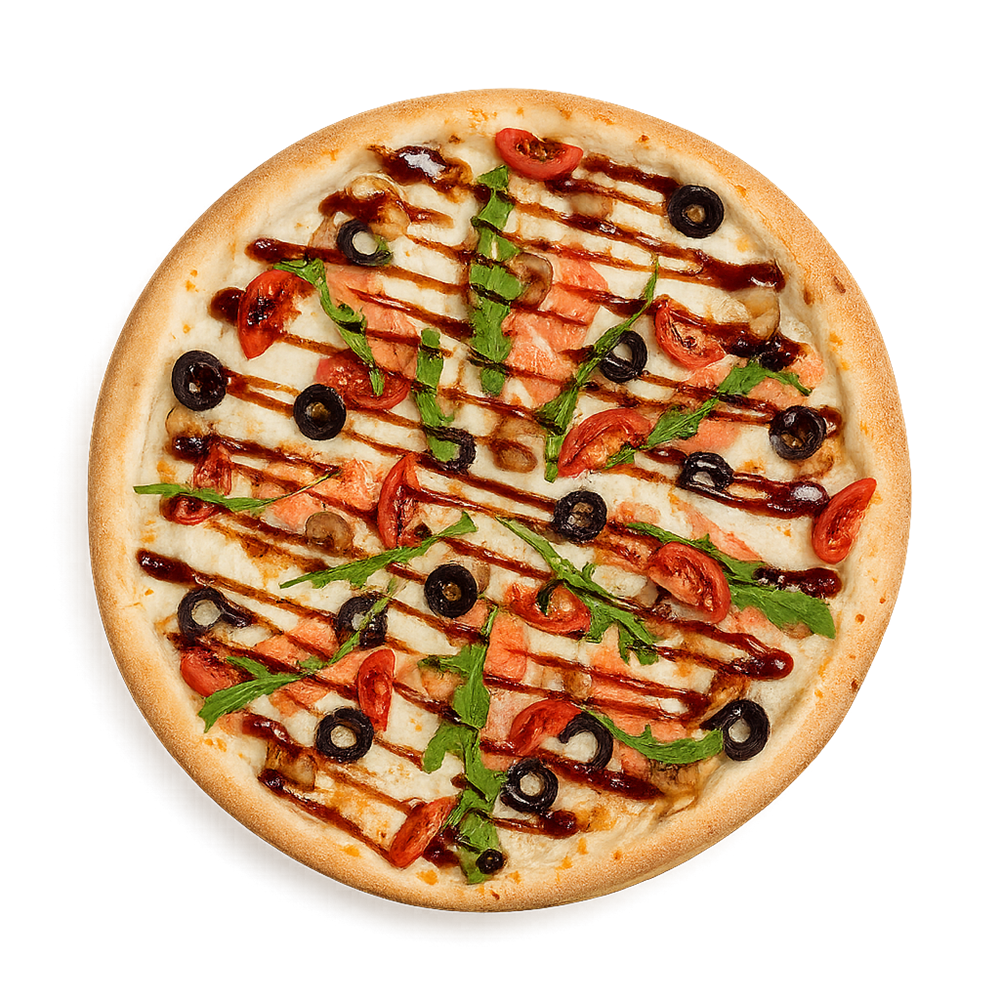 Соус белый, Сыр моцарелла, Креветка обычная, Форель, Маслины. Руккола, Соус терияки.