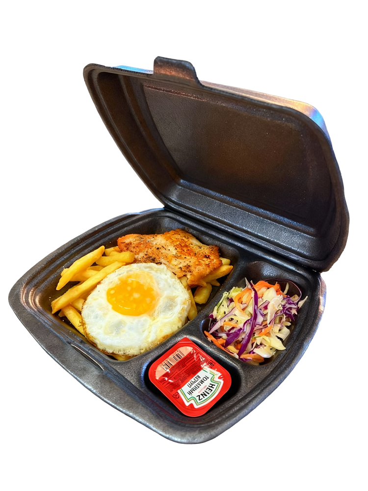 Картофель фри, Куриная отбивная, Яйцо куриное, Салат Клоу Слоу, Кетчуп 1шт.