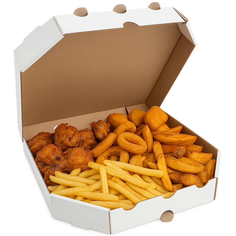 Картофель Фри 150г., Картофель По-деревенски 200г., Крылья Буффало 6шт., Луковые кольца 6шт., Наггетсы куриные 6шт.