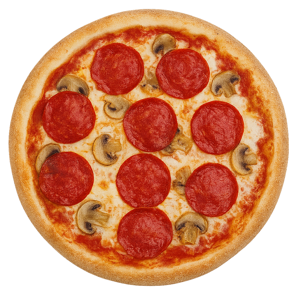 Соус красный, Сыр моцарелла, Пеперони, Шампиньоны.