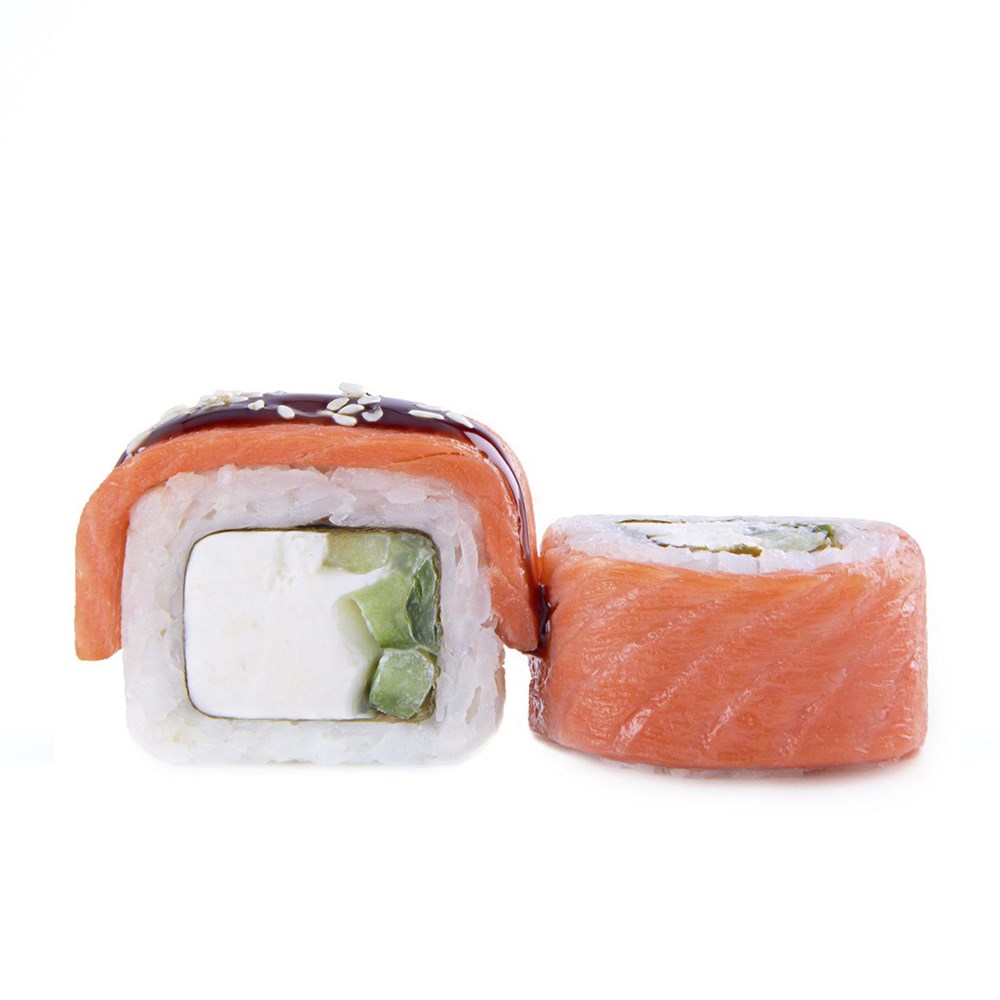 Рис, Норри, Сливочный сыр, Лосось с/с, Огурец, Соус унаги, Кунжут.