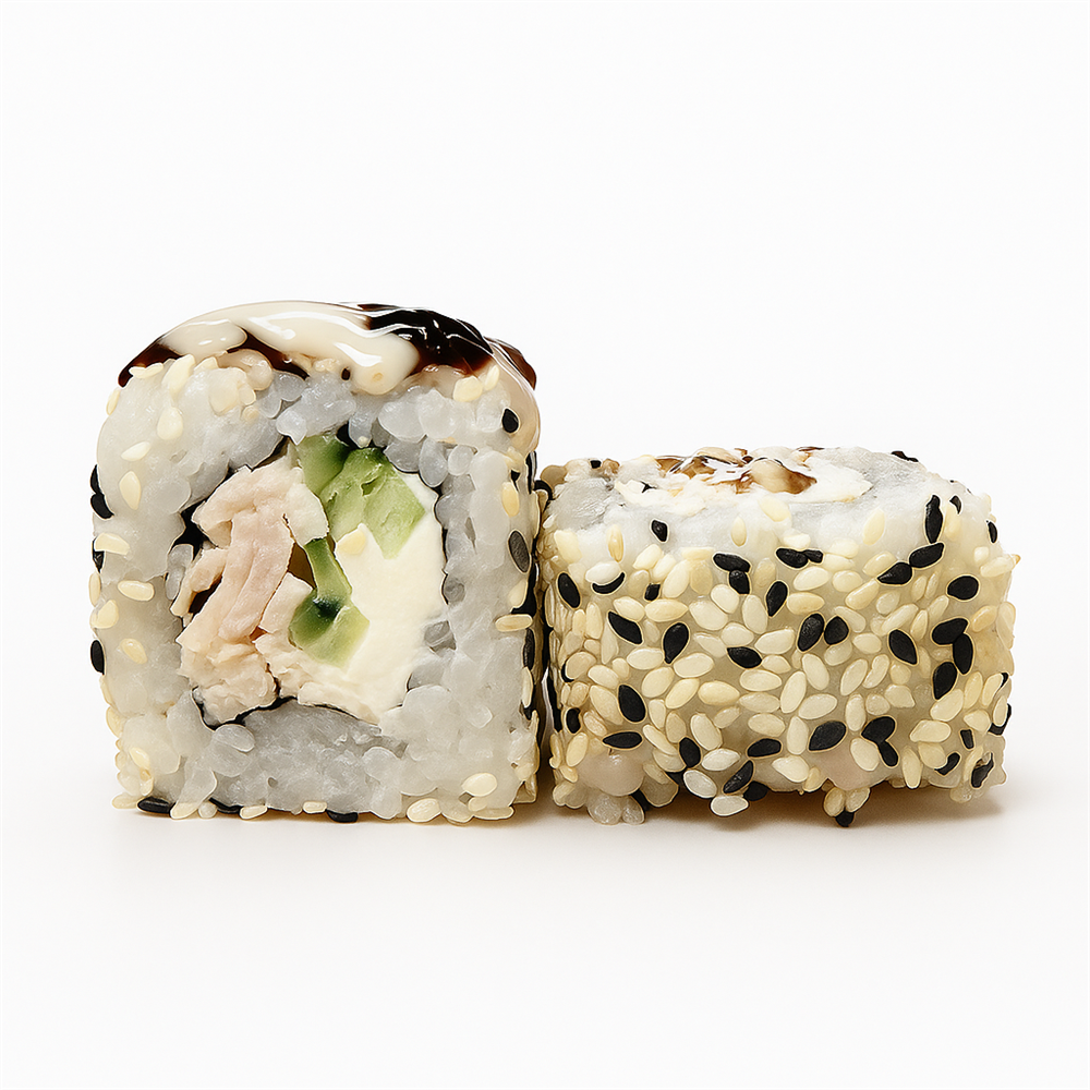 Рис, Норри, Сливочный сыр, Огурец, Копченая курица, Ореховый соус, Унаги, Кунжут.