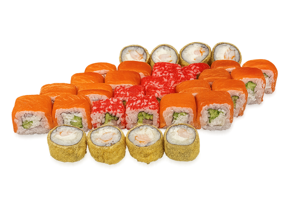 Темпура с тигровой креветкой, Филадельфия с лососем, Филадельфия с копченым лосоем, Калифорния с тунцом.