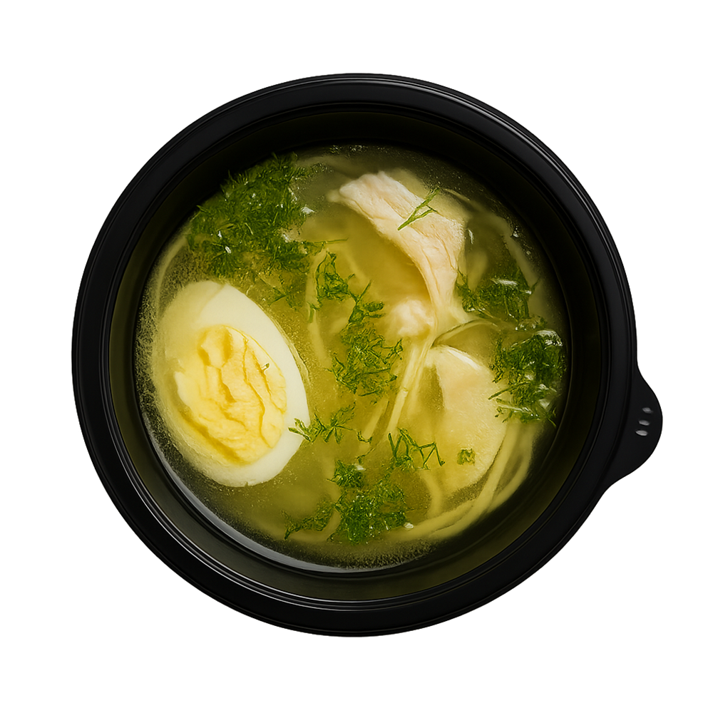 Бульон куриный, окорочок куриный, лапша удон, укроп, яйцо куриное, специи.