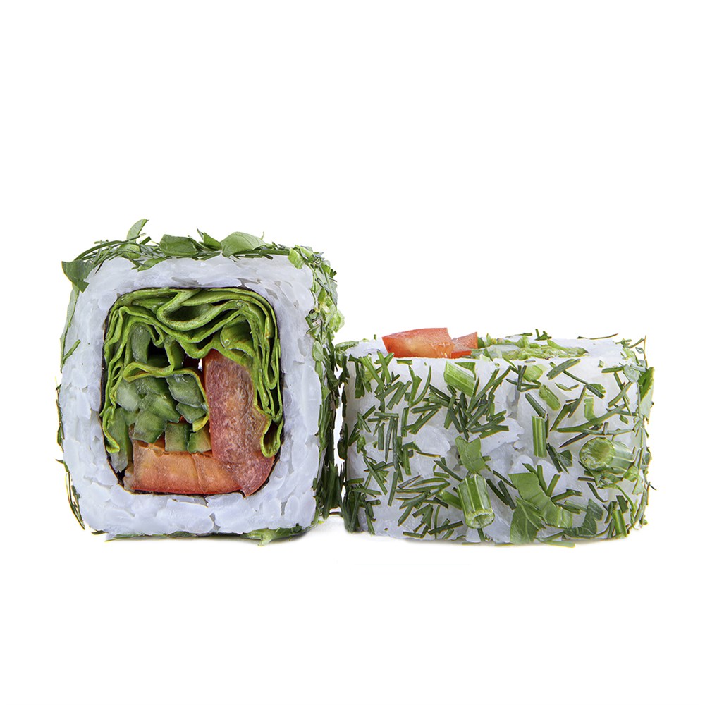 Рис, Норри, Лист салата, Перец болгарский, Огурец, Помидор, Укроп, Соус ореховый.