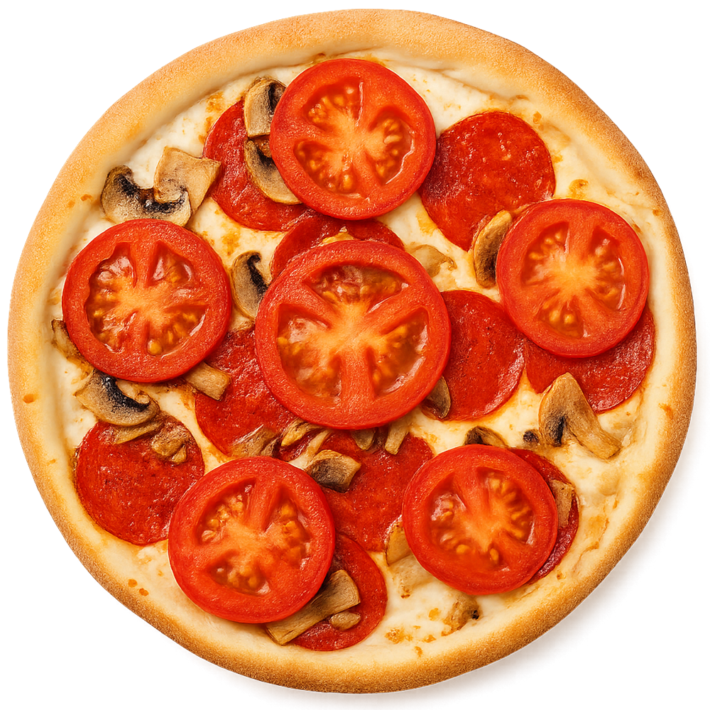Соус белый, Сыр моцарелла, Пеперони, Шампиньоны, Свежие томаты.