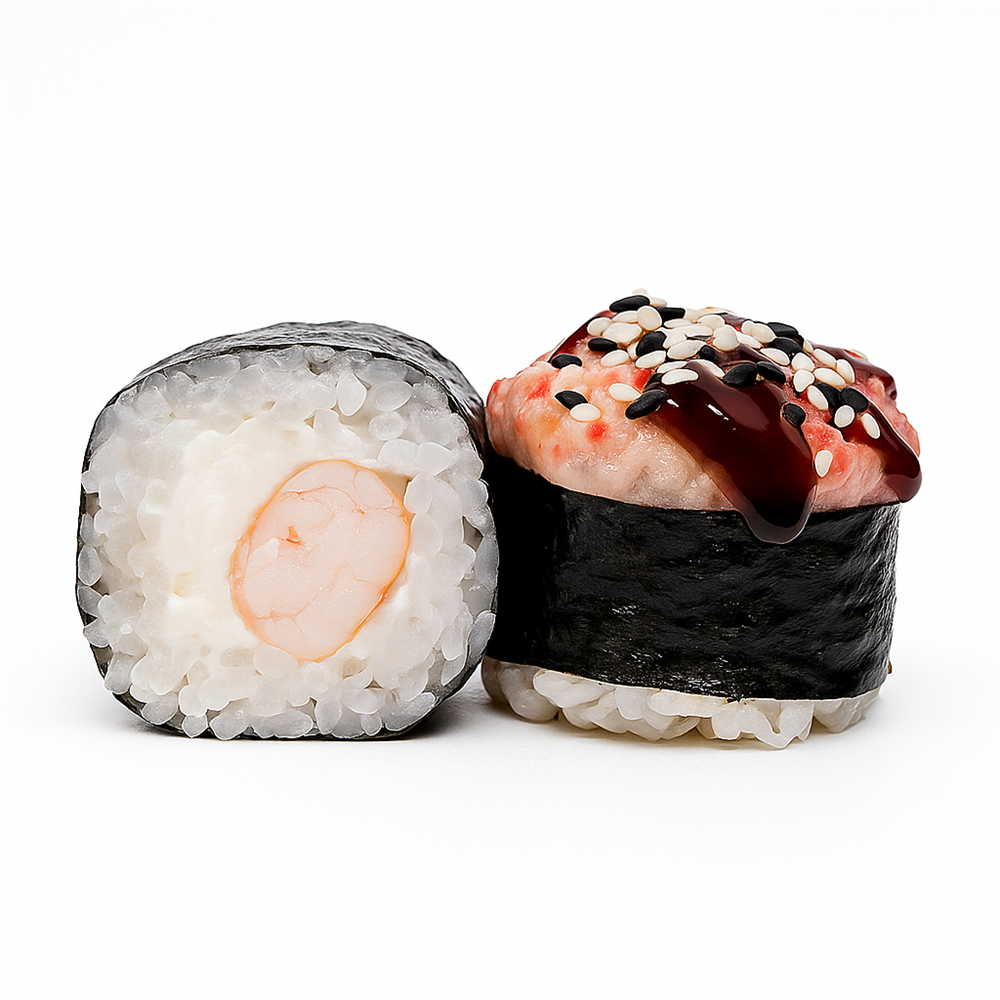 Рис, Норри, Сливочный сыр, Тигровая креветка, Соус унаги, Кунжут.