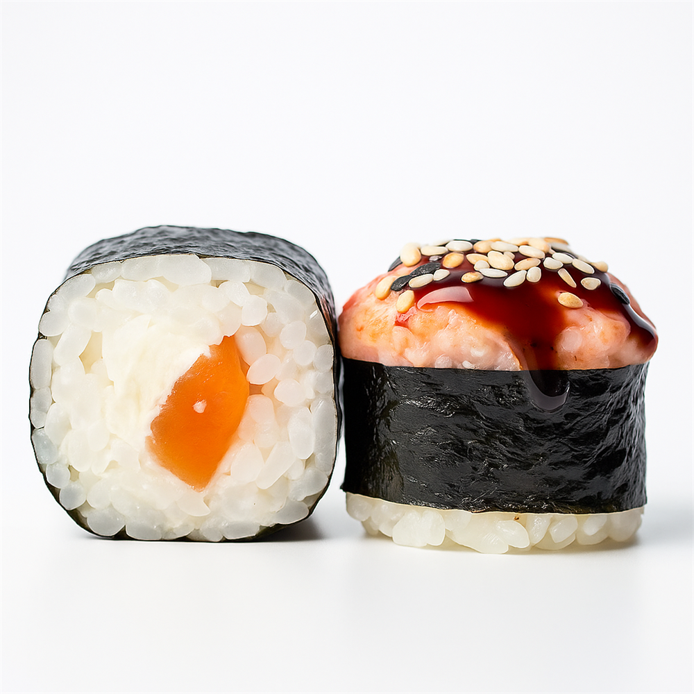 Рис, Норри, Сливочный сыр, Лосось с/с, Соус унаги, Кунжут.