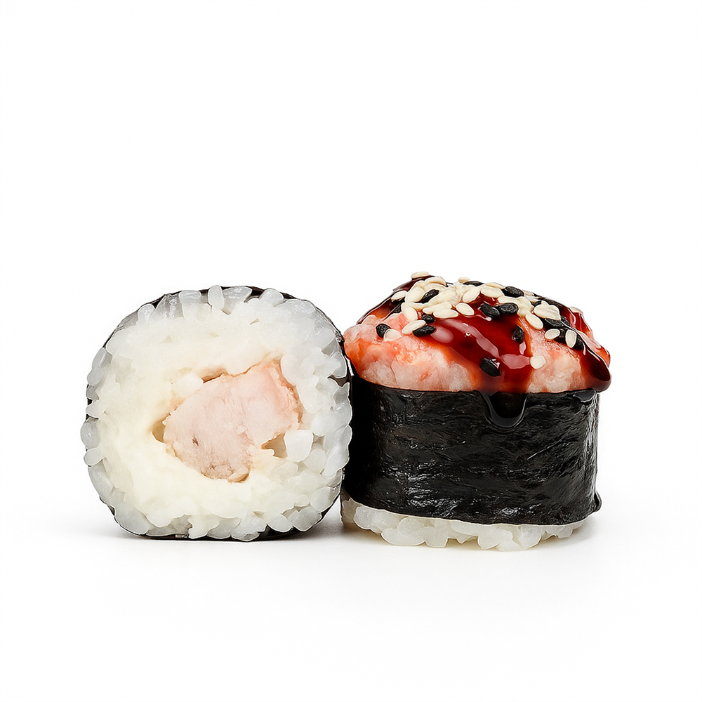 Рис, Норри, Сливочный сыр, Угорь, Соус унаги, Кунжут.