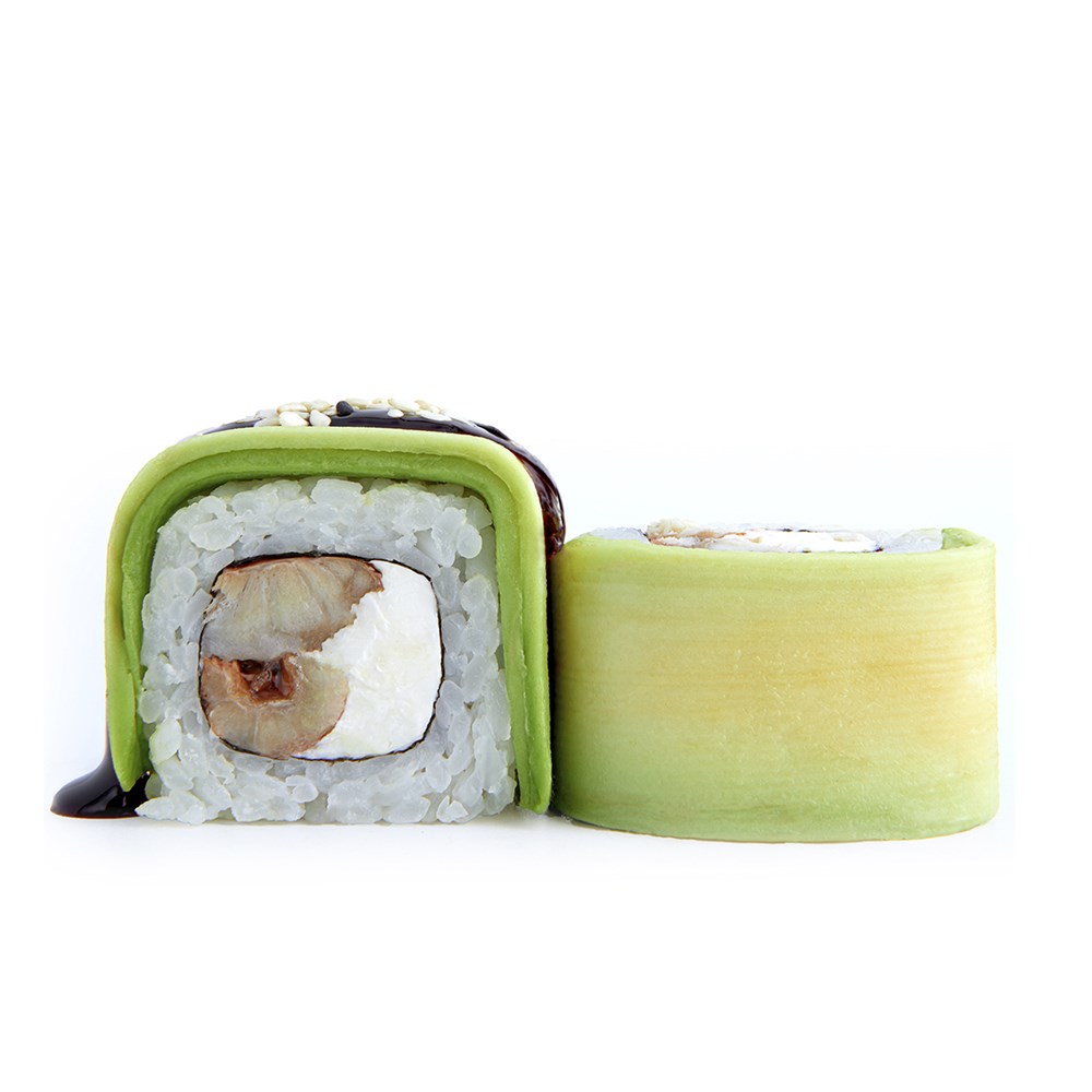 Рис, Норри, Сыр сливочный, Авакадо, Угорь, Соус унаги, Кунжут.