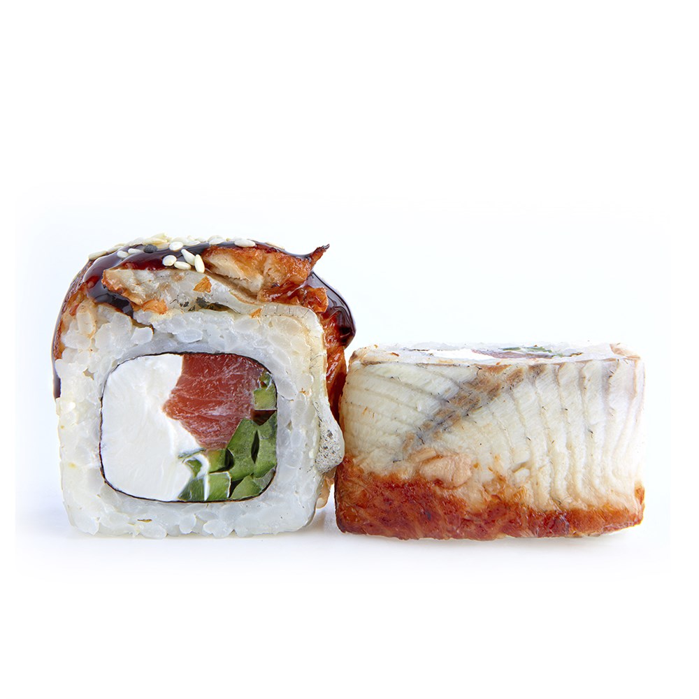 Рис, Норри, Сыр сливочный, Огурец, Угорь, Лосось с/с, Соус унаги, Кунжут.